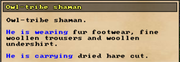 11 KB | Petike | A female player character meeting an Owl-Tribe shaman in an Owl-Tribe village during the summer. Category:NPC images Category:Owl-Tribe images | 1 |