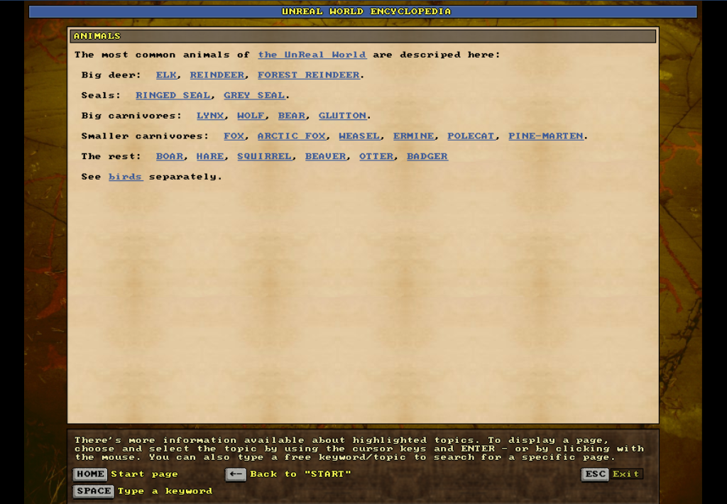The general animals overview in the in-game UnReal World Encyclopedia (accessible at any time by pressing F1).