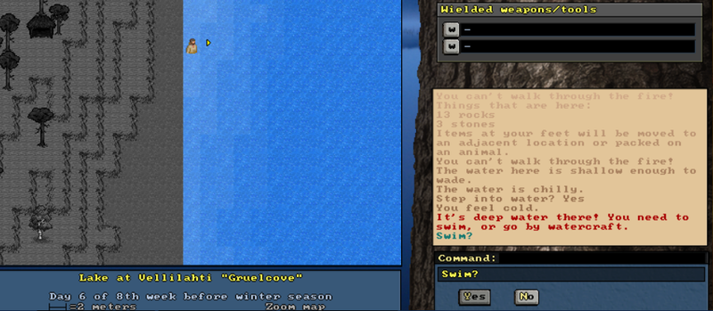 The player character wading through the shallow water at the banks of a lake, leaving it behind and beginning to swim in deeper water.