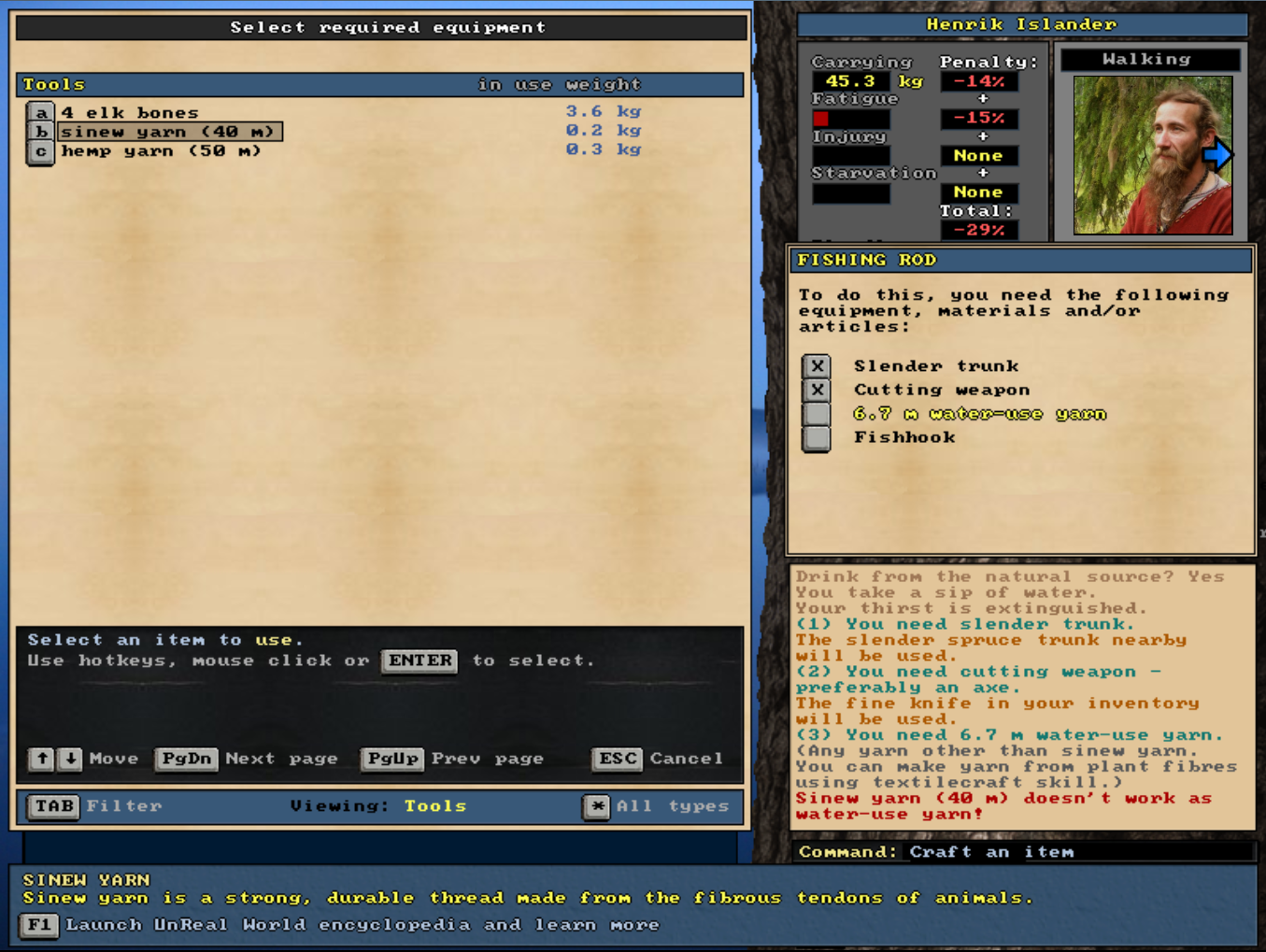 Sinew yarn can't be used for fishing tackle because it weakens and stretches when wet. Luckily Hernik has got