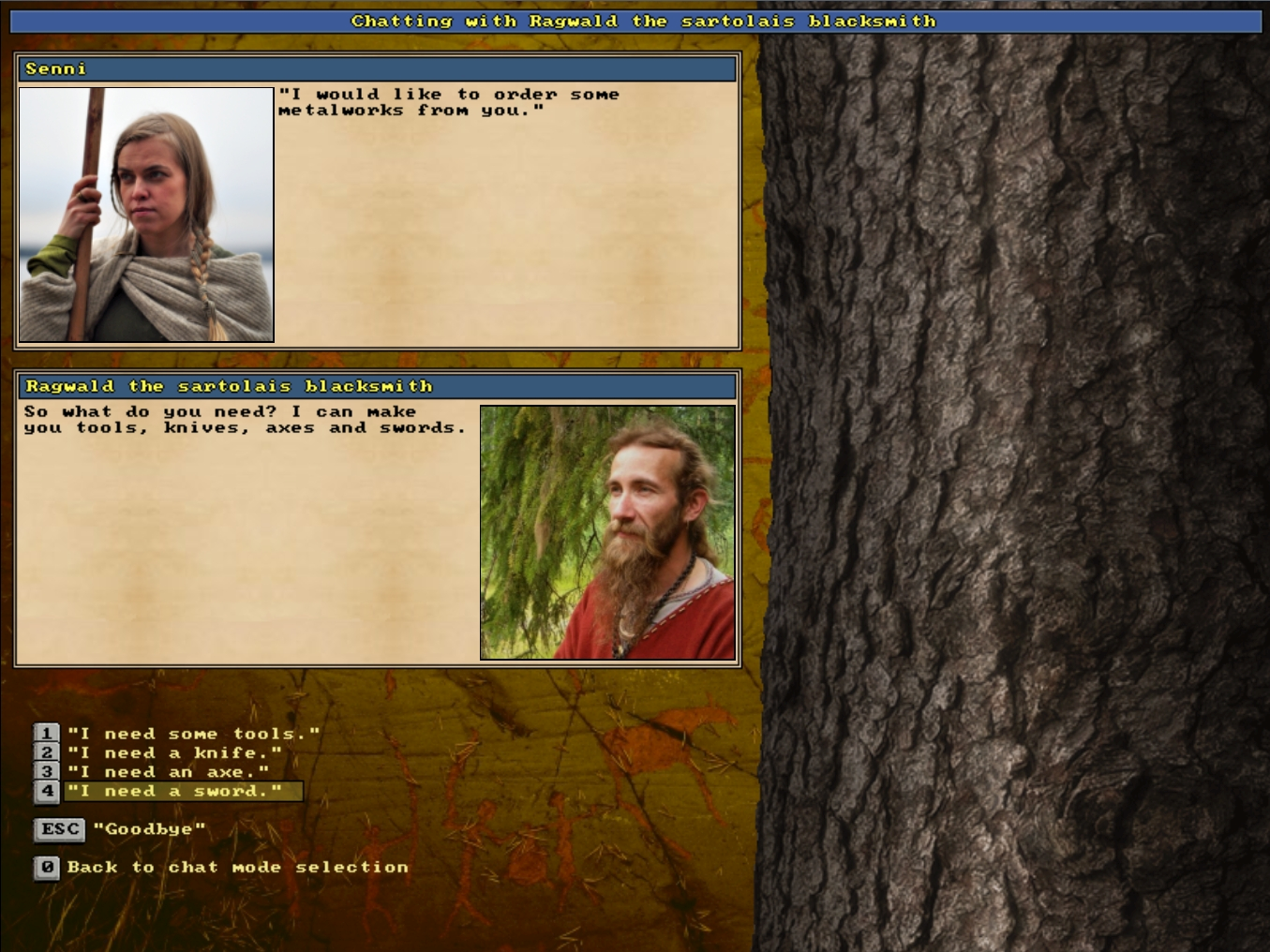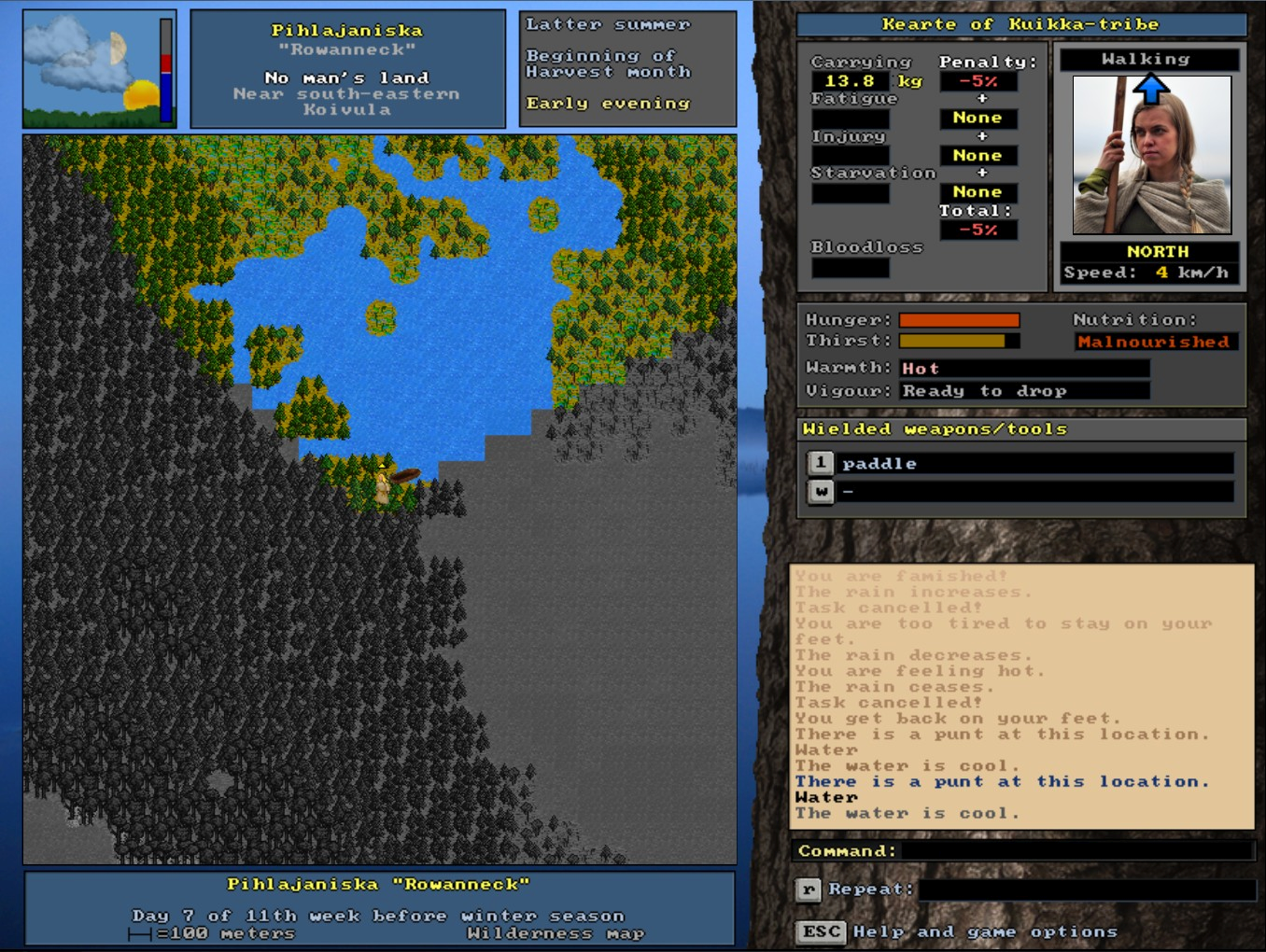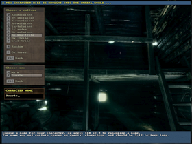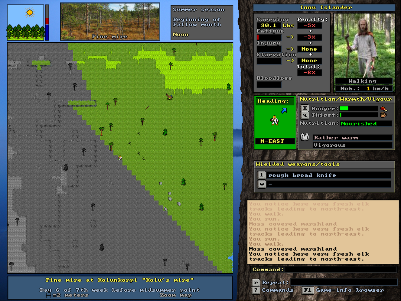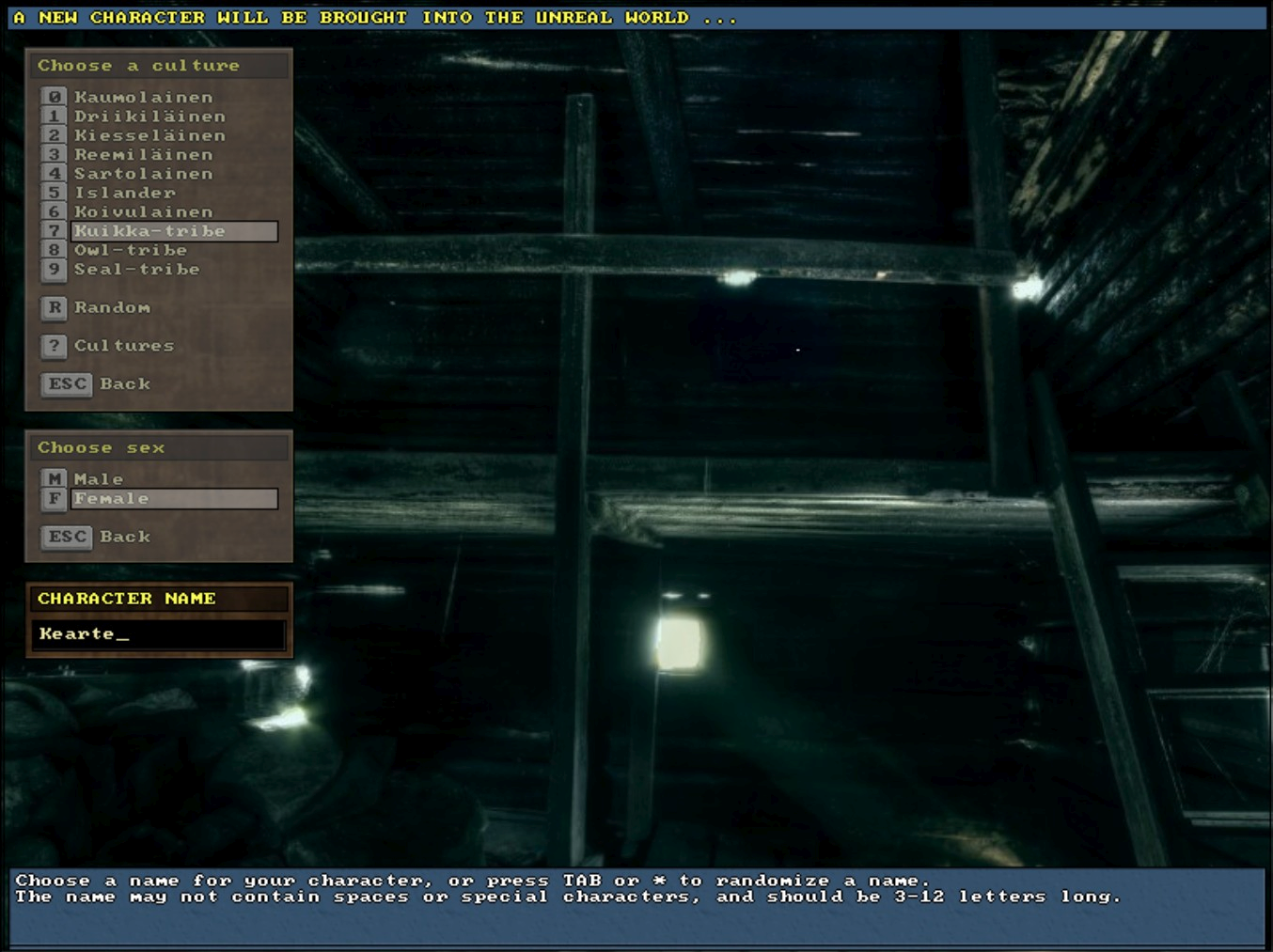 1995Versions 2.04 - 2.08World of the game was still unnamed and undescribed. There was medieval touch to it, but in mundane way. Behind the scenes it had become clear that the game takes place in ancient northern country. Predefined wilderness map and fixed villages were ruled out, and the whole world was made random. Lots of attention was payed on generating the wilderness, villages and local terrain in new and interesting way. Mushrooms, berries and other edible plants were added with their growing seasons and natural habitats taken into consideration. Selecting race (human, elf, orc, etc.) for player character was replaced by choosing one of the early cultures instead. Now it was possible to play only as human character. Multi-level dungeons, orcs, elves and various monsters still existed, but ruling out high-fantasy elements had started.