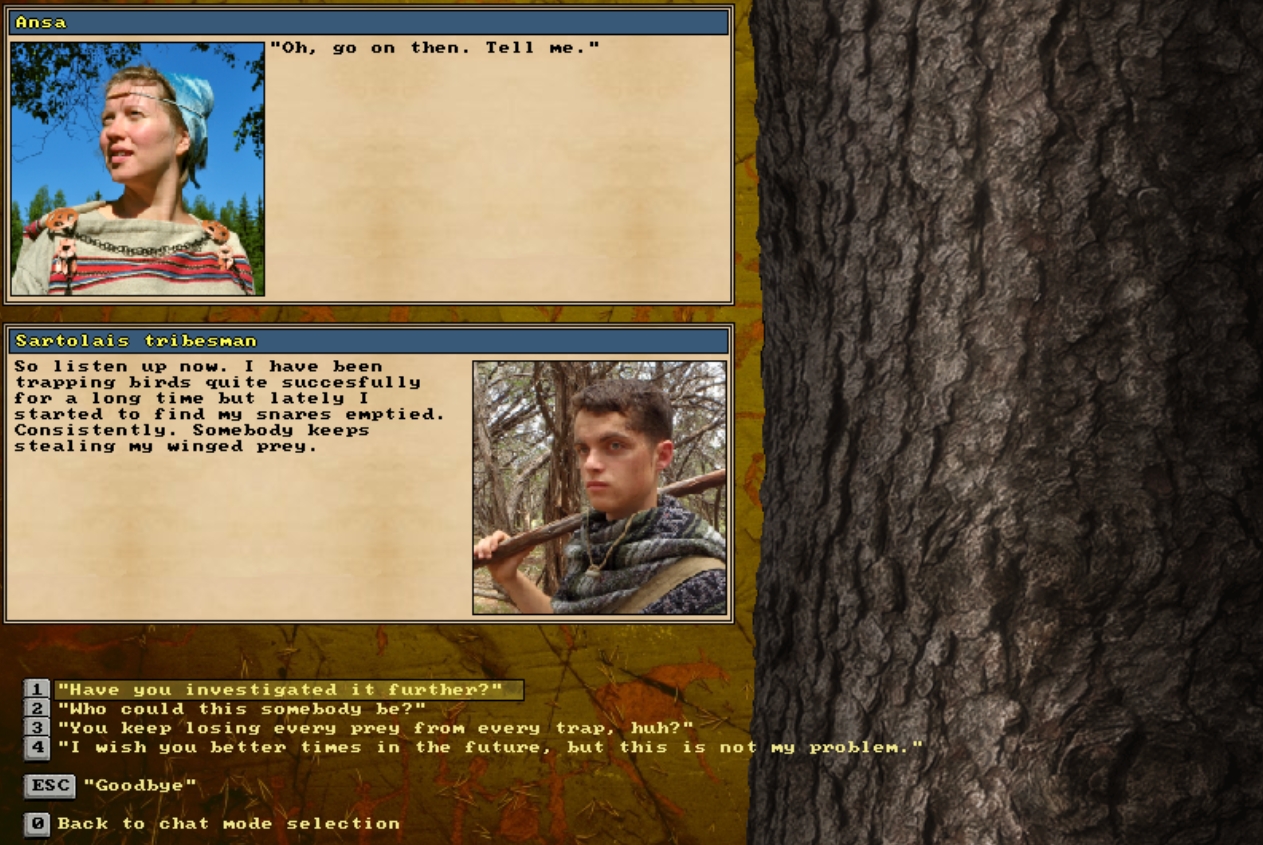 2014Versions 3.18-beta4 - 3.20RR------R--RThe facelift got completed with a galore of new high-quality backgrounds, portraits and terrain type images. By the end of the year the game was also migrated to SDL 2 and foundation for future graphic updates to follow was thus laid. But as always, development priority remained in the game content, and expanding possibilities and improving mechansims of wildlife, village life and NPC behaviour received the most attention. NPCs got a wider scope of reactions towards other people - in addition to being blunt aggressive or peaceful - and got closer to behaviour variety already in use with wild animals. Most notably, Njerpez lost their 'always aggressive' status. True crop cycle was added and villagers started to harvest their fields, stock the products and sow the fields again in the spring. Village resources and restocking was ever improved by adding more variety to availability of everyday tools and materials. Lots of love was given to combat means and rules. Complex weapon breakage and degrade system was created, shield holding modes were added to allow usage of shield to protect from missile attacks - and robber NPCs were introduced. Armour glossary was overhauled for the sake of historical accuracy and variety. One very important core element adjustment concerned the creation of animal populations. Animal populations were thoroughly overhauled and checked resulting in more varied and greater number of wildlife to exist in the world - with animals natural habitats having a much greater role than ever before. Ravens, eagle owls, goshawks and more birds now appeared - with their specific diets, nesting habits, eggs and feathers. And finally, seals were introduced. In august 2014 UnReal World also entered Steam Greenlight. The pressure to go for it had been raising for years already and now we finally gave in and decided to give it a go.