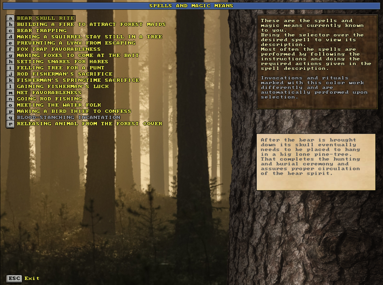 2017Versions 3.40 - 3.50 (beta 2)--R--------R25th anniversary year of versatile productivity. In addition to new versions there was also launching of new forums, adding Steam trading cards, and publishing Shaman Duel short movie. And finally, taking part of special year of celebration. See, in 2017 Finland celebrated 100 years of independency, and UnReal World celebrated 25 years of indie-dependency. But starting from the start...the major new additions added in 2016 - especially the quests - needed certain amount of adjustments, discussion and community guidance but all this was nicely worked out in the early year and 3.40 stable released. Soon after, considerations about adding Steam Trading cards were initiated in collaboration with by Finnish comic artist Tuuli Hypen - who had done some remarkable UnReal World adventuring and fan-art in the past. The process of artwork creation continued for six months - from discussions about possible scene selections, to early sketches, and final set of cards and backgrounds which were proudly released in august. Meanwhile, we had started steadily trucking towards yet another version with a strong focus on the new kind of spells and spells system first showcased in version 3.40. This meaned giving up the old ritual system for good, and bringing the existence of magic means to our desired new level. The new version was not all about the spells though. In the midst of (still) adjusting quests one new quest, with an important new otherworldly being, got added too: the appearance of forest spirit. We also brought into existence cubs and calves - the young animals for relevant wild animal species. Now you could encounter an elk mother wandering together with her calf, or a bear mother followed by her cub. This addition extended also to adjusted behavior of mother animals. Long-awaited new materials to be harvested from carcesses - antlers, bones, skulls and teeth - were also added. With some of these, eg. bear skulls and teeth, there was also a strong underlying link to new spells. This version was not ready until december, but we were able to release beta just in time before Finland's 100th independency day. Steam honoured the special occasion with designated sale of some Finnish titles and we were proud to participate. UnReal World is naturally quite a finnish game, but also the longest-living of them all.
