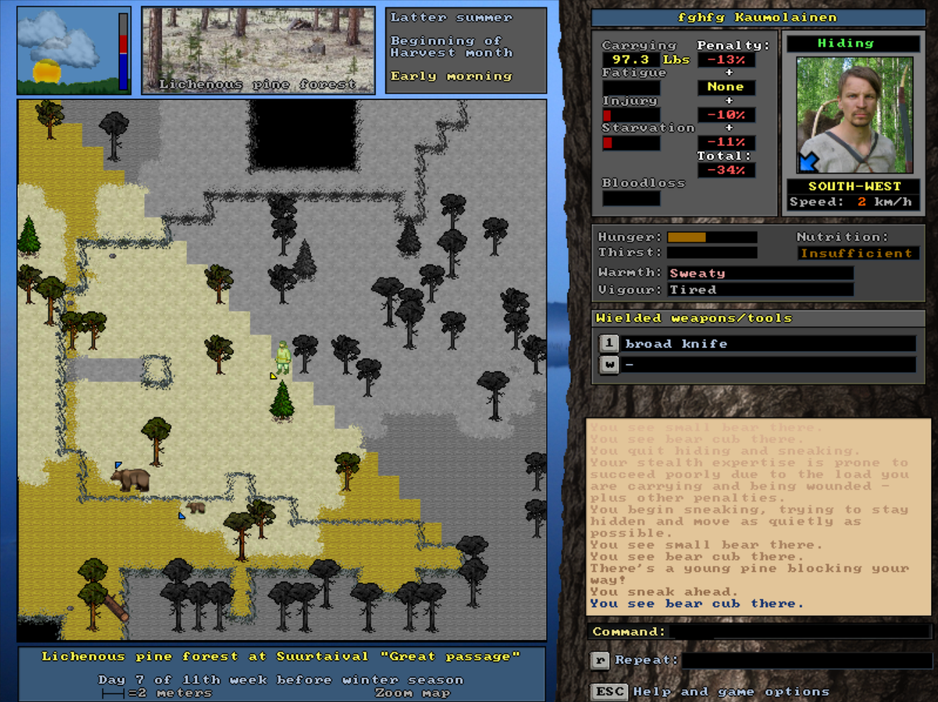 2011Versions 3.13-patch2 - 3.14bR-R--R----RMany recently started major development branches are being improved simultaneously. Nutrition system is expanded to affect character's feeling of hunger based on energy intake, stomach content and bodily energy reserves. Modding capabilities are improved step-by-step allowing more complex mods to be created. Script language is created to allow editing game messages. Porting the game for Linux and MacOSX was started and partially accomplished - the first unofficial ports were playable but very buggy. One big game element which hadn't been touched for a long time was combat. Now it was massively overhauled including rewritten melee and missile combat mechanics, combat messages, wound system and wound treatment.