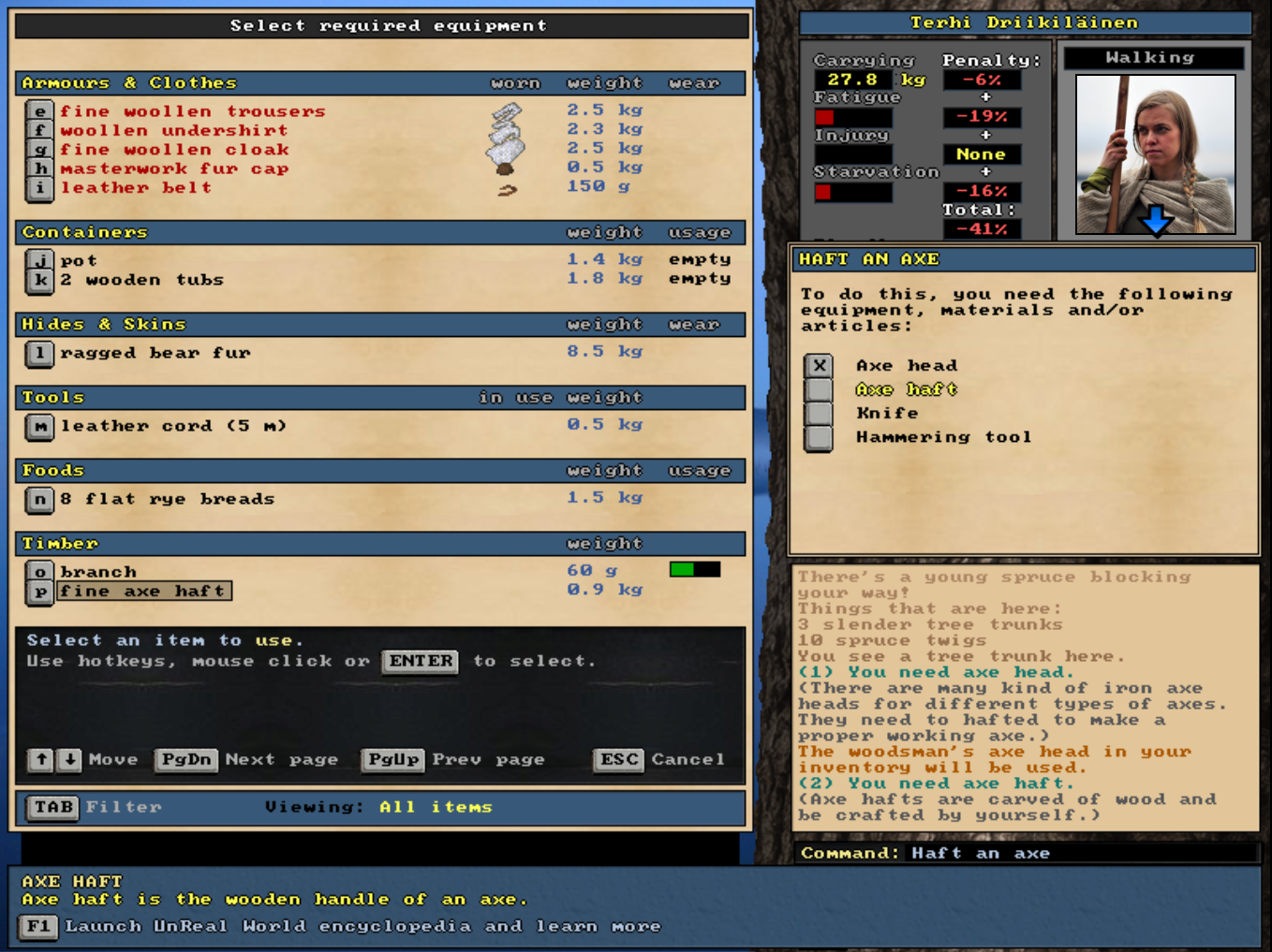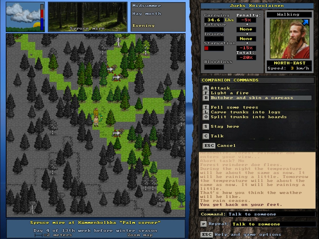 2013Versions 3.15-patch1 - 3.18b3RRRR---R---RA record-breaking year in both number of releases and far reaching overhauls. Village inventory and restocking, item ownership and trading, reputation and reacting to breaches, NPC speech and communal AI - these all are redesigned or created from a scratch. Shop-like storehouses where you purchased the goods from a craftsman were removed and the new era of trading and restocking begun. Goods in each village are now owned by the whole community and you collect the items from different buildings and start trading when ready. Village restocking gets more varied, detailed and population dependant. Species specific diets, predator-prey relationship and feeding behaviour of animals is created. Gregarious animals work as a herd, following their leader. Herbivores (and omnivores) search and eat variety of plants specific to their diet. Carnivores actively search, hunt, kill and eat their prey. A countless variety of incidents can happen as wildlife gets truly alive. A new item selection dialog is designed to allow easier selection and viewing of items. UI convenience boost is also added for handling items. Overall graphics facelift is initiated by replacing grainy old portraits and backgrounds with fresh and crisp images. And living in UnReal World in general gets more hardcore as all physical activities are given individual levels of effort and the character needs to meet specific physical condition requirements to perform certain tasks. The game became free to play donationware.