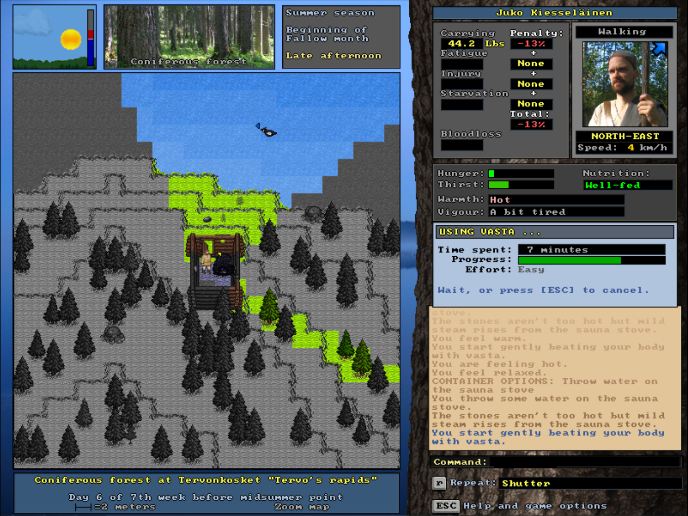 2020Versions 3.62 - 3.63--R---R-----Last year started with fractured shoulder, and this one with the outbreak of global pandemic. Extra hassle and worries appeared in most peoples daily lives and routines, but we still managed to release two new versions. It also came to our attention, by an e-mail from a player, that in february 2021 UnReal World had lasted 10,000 (ten thousand) days in real life. This was calculated from the date stamp in executable file of version 1.00b distribution archive. We don't even remember the exact release date, but it was summer of 1992. So the continuing lifespan of the game in early 2021 was at least 10,000 days - and the days and releases have kept rolling also after that. First release of the year was a bunch of miscellanous additions and bugfixes on all fronts. Few memorable things could be for example milking reindeers, pausable pit digging and possibility of Njerpez warriors wandering in groups. The second release had majority of its new features specifically related to the lush of the summer, with also significant amount of improvements to the fire mechanics. These kind of go hand in hand. Now you could build sauna stoves, and make a vasta broom for sauna bath, but also gradual heating up of fireplaces (including sauna stove) was introduced. With these fireplace related additions more attention to heating was now required to have your cottage nicely warm during the coldest winter days. With the new fire mechanics fire burning in general, its' warming effect, obtained information and visual appearance all became more detailed. For example, embers now accumulated and glowed according to the amount of fire burned and information about the burnt-out fire could be obtained by looking at it. And so on. The smoking cookery method for food preservation was also made more realistic requiring continuous maintaining of fire through the whole process. When it comes to the lush of summer it was also seen in the addition of leaf trees growing and losing their leaves gradually according to the season. This was mostly a visual enhancement but also had some use in the game-mechanics for example when collecting birch twigs. See, you need leafy summer twigs to make a vasta broom. The sauna experience also got a bit more moody with new audio and messages.