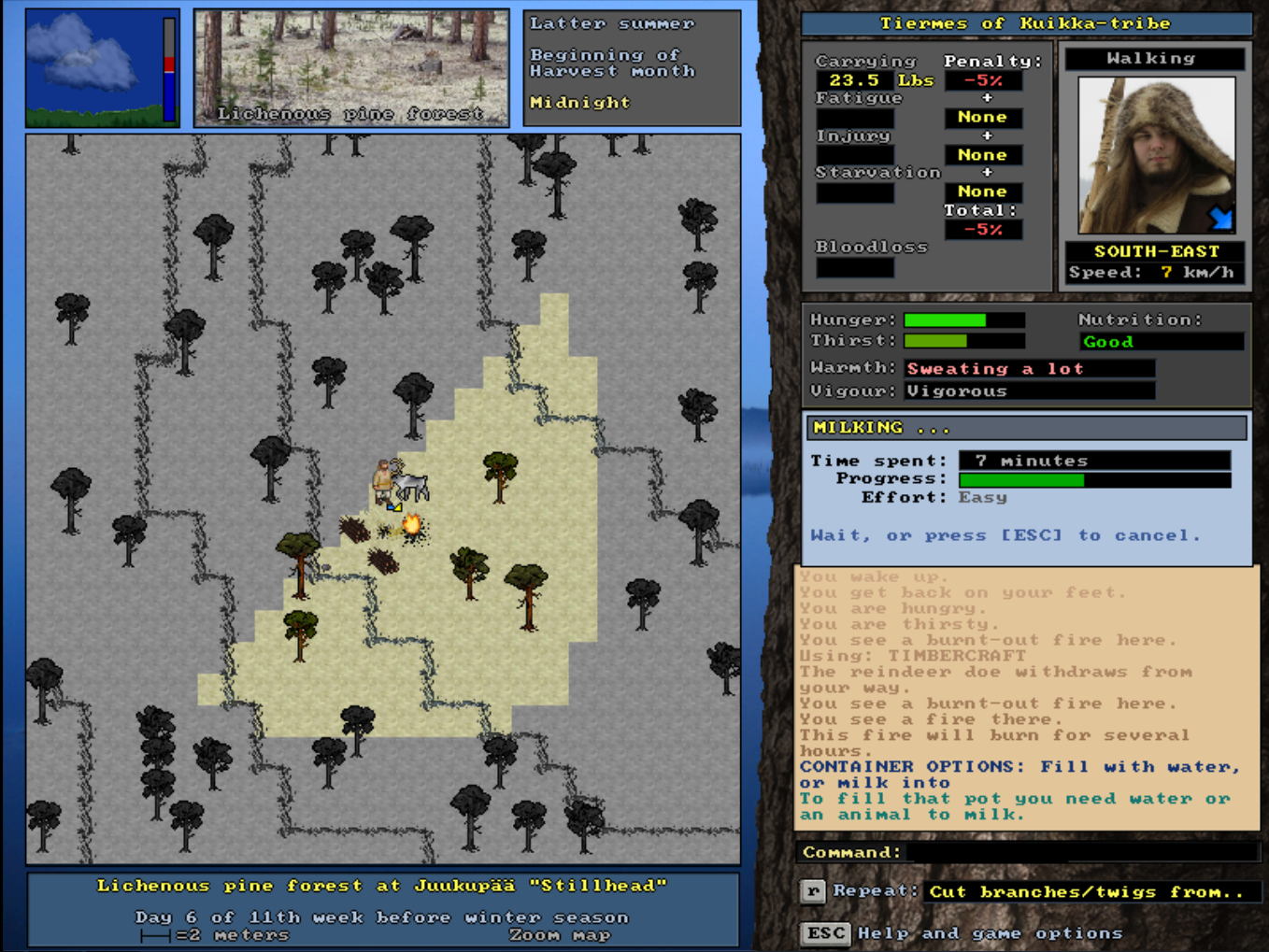 2003no release------------No release doesn't equal to no development. It just took 14 months to finish the next public release. 2004Version 2.80--R---------The game was about iron-age in the far north. Living of the land, hunting, fishing, crafting and building were core elements of the game. Social life was there; getting married, interacting with other human beings and also with the supernatural. But one important source of livelihood had been missing until now: agriculture. This version was clearly focused on agriculture, utilizing crops and preserving food. Life cycle of the plants was improved, cookery recipes were improved, and AGRICULTURE-skill now allowed the character to lead more settled lifestyle.