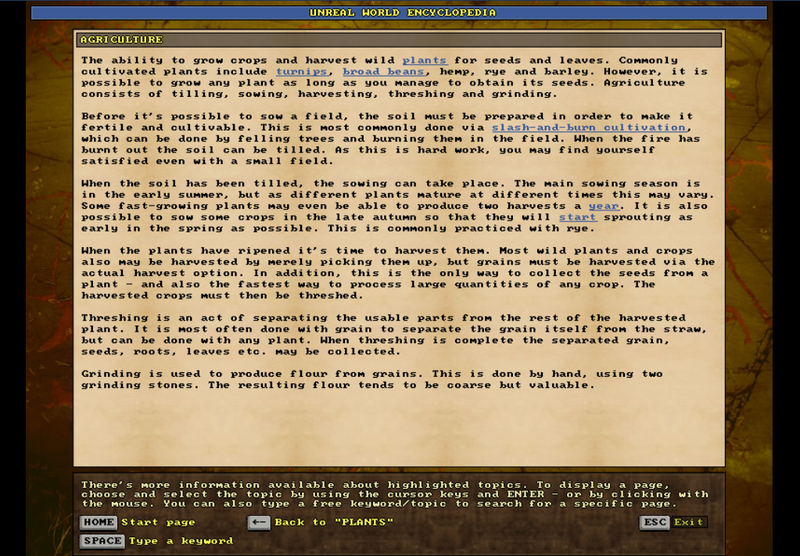The agriculture entry in the in-game UnReal World Encyclopedia (accessible at any time by pressing F1).