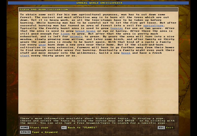 The slash-and-burn agriculture entry in the in-game UnReal World Encyclopedia (accessible at any time by pressing F1).