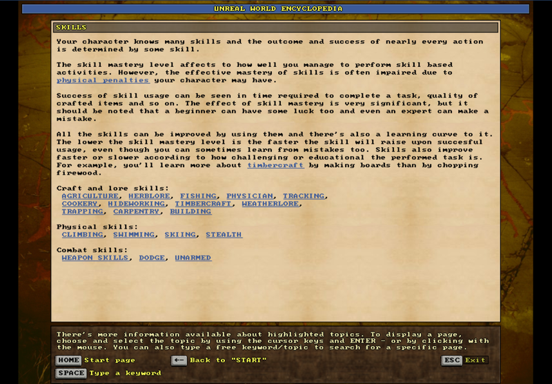 The general skills overview in the in-game UnReal World Encyclopedia (accessible at any time by pressing F1).