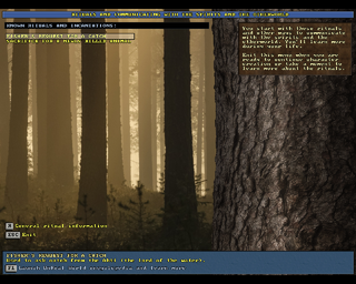 Every new character starts with the knowledge of two rituals. The rituals are random and there isn't much to do in this screen. It's possible to check the game encyclopedia entry of the rituals by pressing F1. In this version of the game (3.40b3), the player character will eventually learn all available rituals and it's possible to have a successful character without using rituals at all.