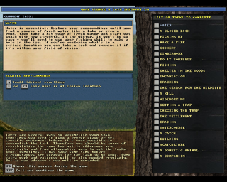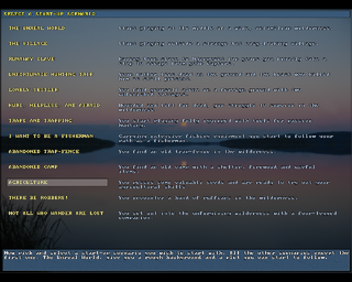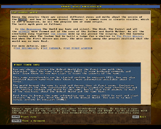 After all the work, there's a nice screen with nothing to do but read the short message and then press a key. This saves the character and then immediately loads it again and takes the player to the UnReal World. The first time a new adventure begins, the player is first taken to the game encyclopedia, which can be exited with Esc. Then, the game reminds the player of the scenario they've selected and, after pressing a key, the player is taken to the main game window with either wilderness or local terrain map visible, depending on the selected scenario. If there's an active game course, the game course screen pops up right after getting to the map.