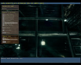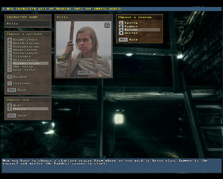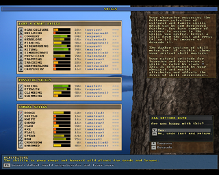 There are four options for creating a new character in UnReal World, under the option Create a character in the game's main menu. The first one of these options, Quick and easy, only asks the player for a character name, gender and avatar, the other character creation steps being automated. Out of the other options, custom is the standard way to create a character and the other two options, custom - easy and custom - too easy, provide the player with the option to increase skill levels by degrading other skills, the amount of degradation and increasing depending on the level of ease. With the easier options, in addition to the five skill points allowed in the standard option, the player is allowed to subtract one or two points from all the skills he wants and similarly increase the skills he wishes by two or three points, or until the skill's level reaches zero or master.
