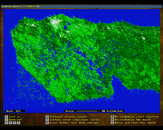 The game takes a few moments to generate a new UnReal World where the player character lives. The character's starting location is marked by a small reddish square. The starting location can be rerolled ad infinitum like stats. A shrewd player takes screenshot of the map available here, and another screenshot zoomed in on the starting location. It's possible to distinguish important terrain features from this map like rivers and rapids. (Rapids are the white pixels on rivers, light blue ones are fords.)
