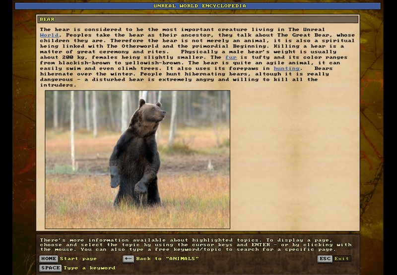 The bear entry in the in-game UnReal World Encyclopedia (accessible at any time by pressing F1).