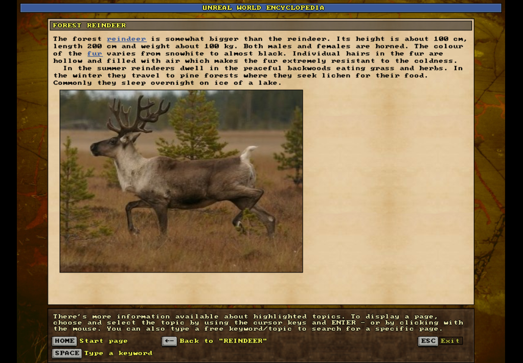 The forest reindeer entry in the in-game UnReal World Encyclopedia (accessible at any time by pressing F1).