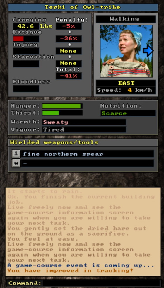 A screenshot of the player character receiving an automated reward (and aid) - an increase to the tracking skill - for reaching the "Tracking" objective (goal no. 11) in the Living in the Wild game course.