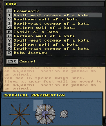 Complete kota construction menu, showing all of the building options for the individual parts and sections of the dwelling.