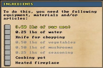 | current | 01:23, 6 December 2018 | 358 × 238 (69 KB) | Petike (Talk | contribs) | Screenshot of in-game information interface on the Meat stew recipe. Category:Recipe images |