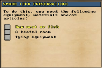Smoked food is meat or fish that has been preserved by smoking it by hanging it in cords in a heated room for 16 (for meat) or 20 (for fish) days. The room must be heated when initially preparing the meat; as of version 3.63 it must continue to be heated after preparation until the smoking process is complete, with a fire burning for a few hours each day. 1 ft of cordage or other tying equipment is required for every 2 cuts of meat, and the tying equipment is refunded once the process is complete. A minimum of 20 branches or 5 firewood is required to be burned every day to avoid any spoilage. If you miss a day you'll need to double the fuel.